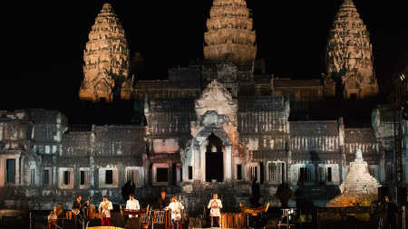 Having the World Heritage, Angkor Wat as the background for the stage, we played pieces from our original songs, popular songs of each country, and the song named ONE ASIA specially composed for this occasion, with the traditional instrumental artists from Cambodia, Thailand, Indonesia, and Vietnam. The VIPs and cabinet members were in the audience including Sok An Deputy Prime Minister of the Kingdom of Cambodia.